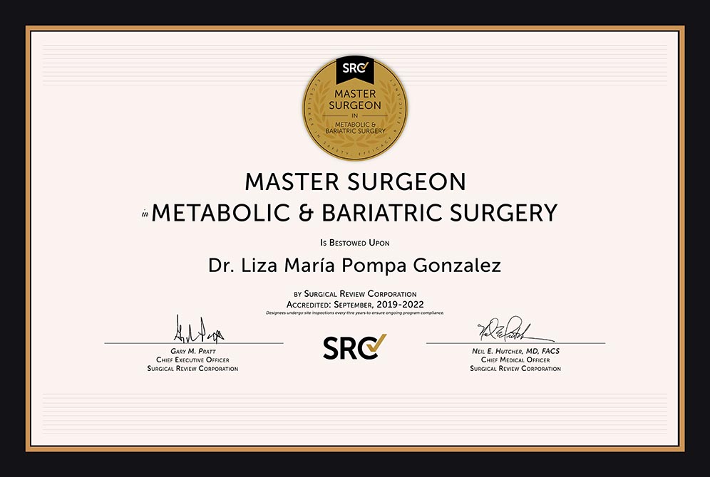 At LIMARP in Tijuana, Mexico, our founder and lead surgeon, Dr. Liza María Pompa González, is recognized as a Master Surgeon in bariatric and metabolic surgery, a prestigious certification granted by the Surgical Review Corporation (SRC). This distinction is awarded only to highly skilled surgeons with extensive training and experience in advanced weight-loss procedures.