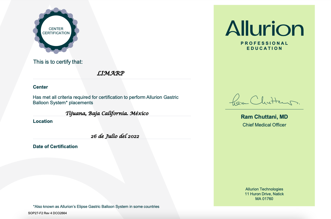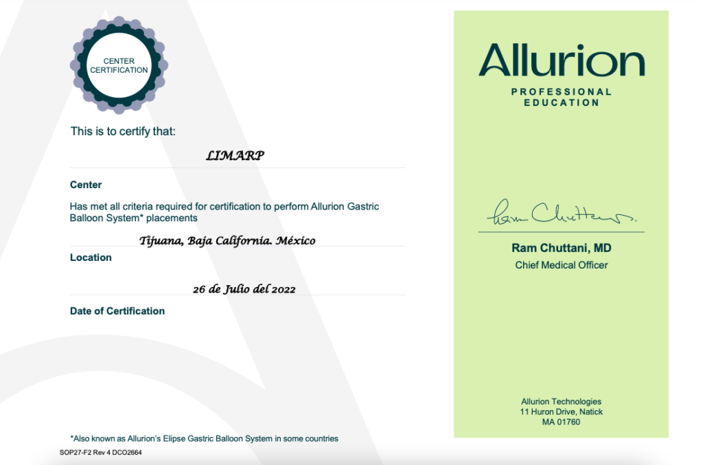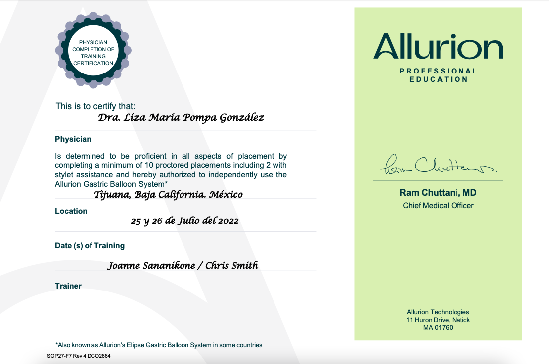 As the only bariatric clinic in Tijuana that offers Allurion to patients, we want to ensure that our medical team is always up to date in order to provide the top-quality services that characterizes LIMARP® as one of the best clinics on both sides of the border. Dr. Liza María Pompa González trained with experts in Allurion to earn the necessary certifications and in July of 2022, she completed the courses needed to be proficient in all aspects of placement by completing a minimum of 10 proctored placements including 2 with stylet assistance and hereby authorized to independently use the Allurion Gastric Balloon System.