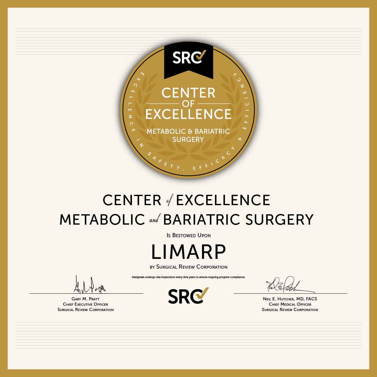 The Surgical Review Corporation is awarded to individual, highly experienced surgeons whose specialty in metabolic and bariatric surgery has undergone rigorous evaluation in terms of extensive experience, safety, efficacy, quality, and efficiency.